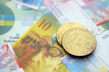 Swiss franc banknotes and bitcoin. The current francs money bills and bit coin lies on table in big amount. The concept of taxation and business in Switzerland
