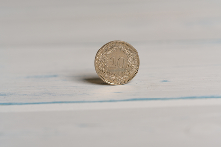 A 20 centimes Swiss coin standing on a wooden background