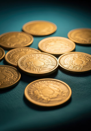 Shiny gold coins scattered on teal fabric surface with selective focus highlighting detailed engravings and currency texture.