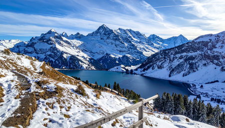 Majestic winter landscape featuring a serene lake surrounded by snow-covered mountains in Switzerland