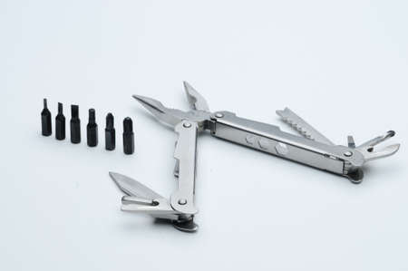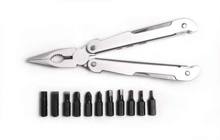 Steel multitool on white background