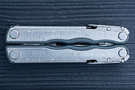 one gray metal closed multitool lies on black wooden table