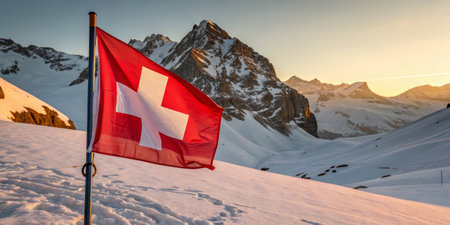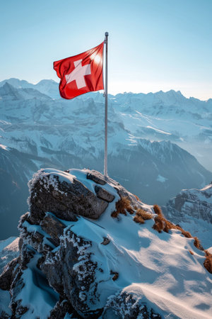 Swiss flag waves proudly atop a rugged mountain peak, showcasing the nations beautiful emblem against a stunning alpine backdrop.