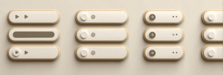UI elements display play buttons, sliders, and volume controls designed for user-friendly navigation in a minimalistic style.