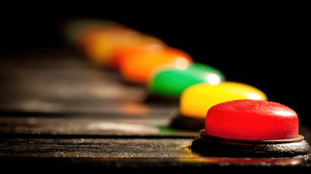 A close-up captures a row of vibrantly colored buttons set against a dark background. The composition employs selective focus, highlighting a red button in the foreground with others fading into the distance. The lighting suggests an indoor setting, with potential applications in technology or design projects.