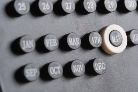 Month May on stylish black calendar, close up.