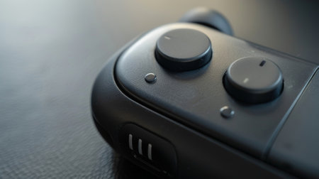 Electronic control panel made of plastic with buttons and levers. The background is blurred.