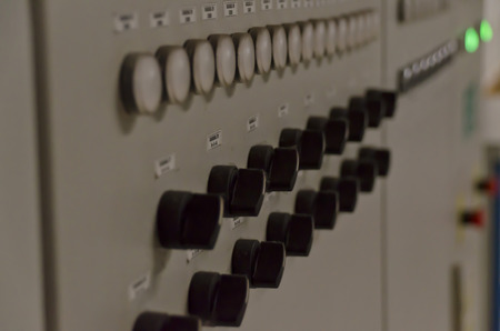 Technical display on control panel with electrical equipment devices cabinet. Empty space above the buttons for your text