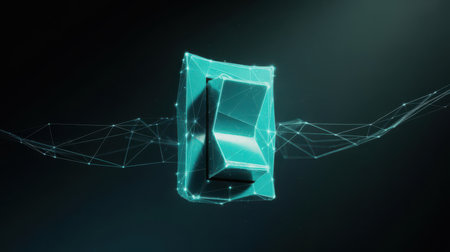 A teal colored 3D geometric shape is surrounded by a glowing white wireframe network, suggesting digital connections and data flow against a dark background. Clear details and vibrant colors enhanc...