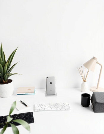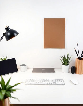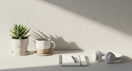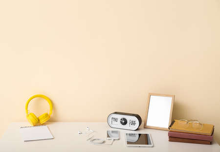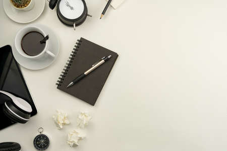 Comfortable workspace with potted plant, alarm clock, coffee cup and picture frame on white table. Copy space.