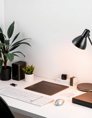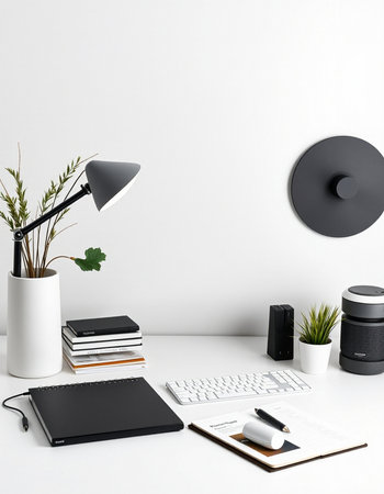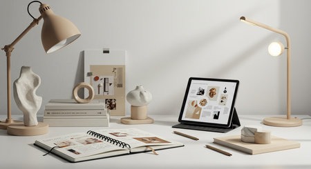 Clean, well-lit desk setup with a tablet, stylus, open notebook, and decorative elements, fostering a productive and creative environment.