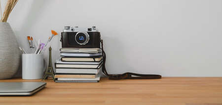 Close up view of worktable with camera, painting tools, books, stationery and decorations