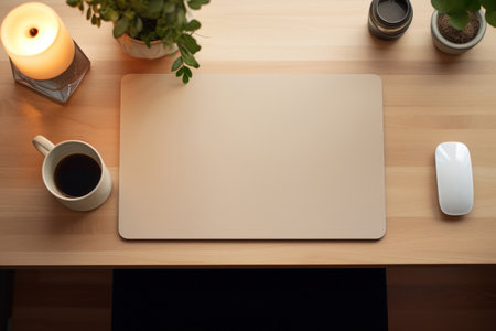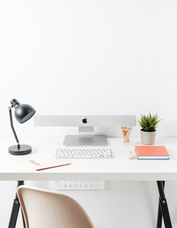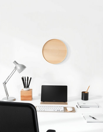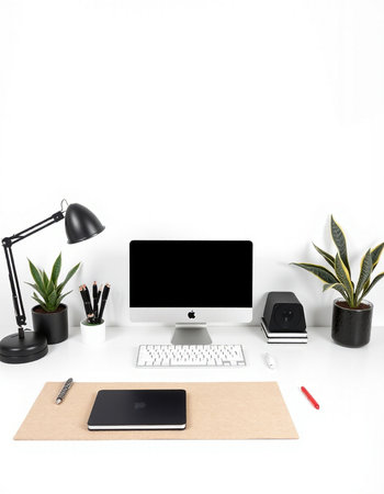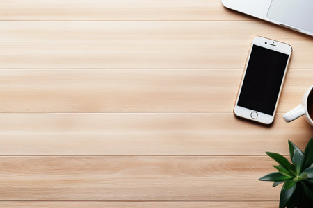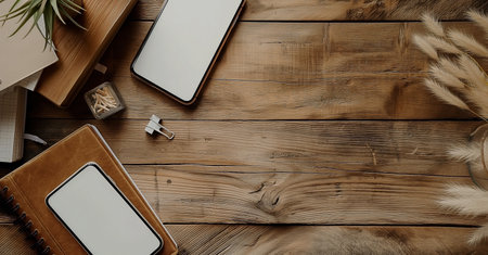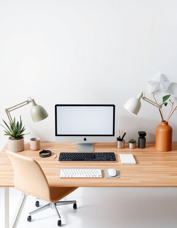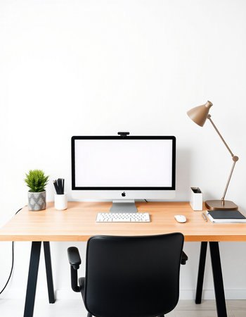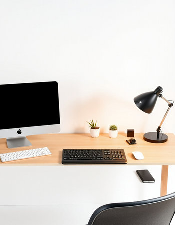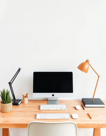 Productivity at its Best: A Stylish Wood Office Desk with Modern Devices and Essentials