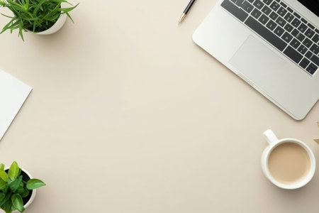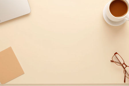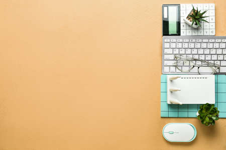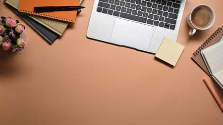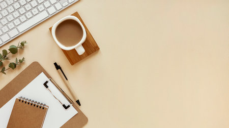 Office desk table top view with office supply, beige table with copy space, beige color workplace composition, flat lay