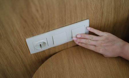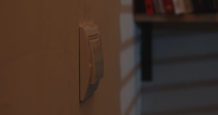 A hand reaching to turn off a light switch, focusing on the finger position in a clean interior setting, showing daily routines.