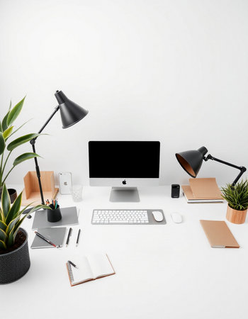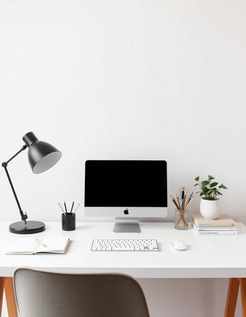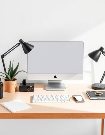 Modern workplace with computer, lamp and other items. Mock up, 3D Rendering
