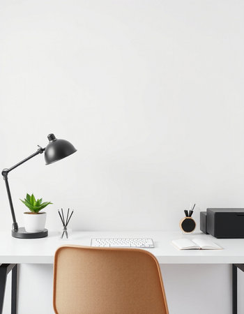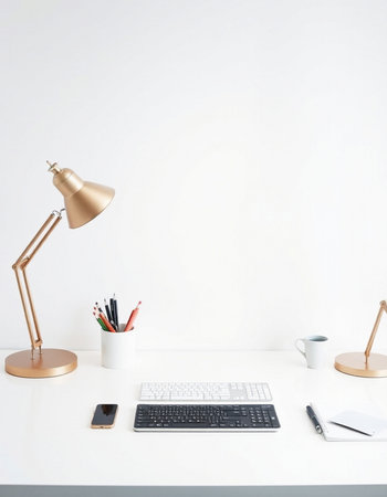 Minimal workspace with copy space and office supplies on white wooden desk and white brick wall background