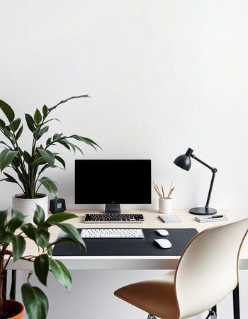 Minimalistic designer workspace with blank computer monitor, keyboard, mouse, lamp and chair. Mock up
