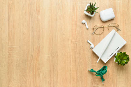 Wi-Fi router, earphones and eyeglasses on wooden background