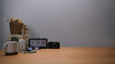 Mockup with copy space with mug, flower, desk clock, camera and smartphone.