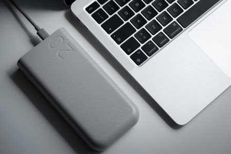 Laptop charged by powerbank with type-c socket. Powerfull battery fast chargind with power delivery technology. Portable charging source for travelling, smartphone or laptop.