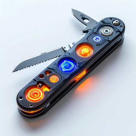 A high-tech multi-tool knife glows with internal power, its blue and orange lights hinting at advanced capabilities. This futuristic survival gadget, isolated on a clean white background, represents the pinnacle of modern engineering, preparedness, and innovation for any challenge ahead.