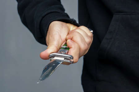 hand of a male criminal in blue black clothes and a gray green knife behind his back on the street