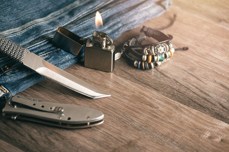 Steel butterfly knife (balisong) ond lighter on a wooden background