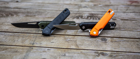Folding pocket knife on a dark gray table