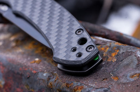 Knife with a unique lock. A knife with a lightweight handle. Vertical frame.