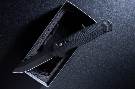 Lay the pocket knife at an angle on the box. Black knife at an angle. Loe key.