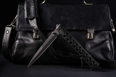 Large folding knife on the background of a leather briefcase. Bent knife and leather briefcase.