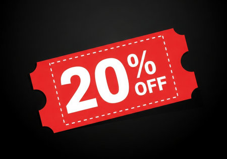 A vibrant red ticket with a perforated edge displays 20% OFF in bold white lettering, signifying a discount or sale.