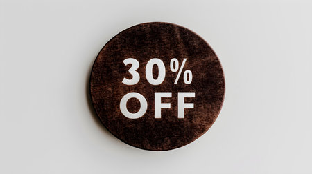 White '30% OFF' Text on a Dark Brown Round Paper Note. White background with copy space