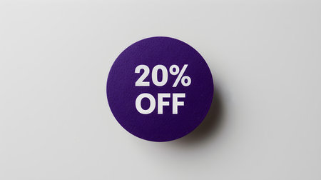 White '20% OFF' Text on a Dark Purple Round Paper Note. White background with copy space