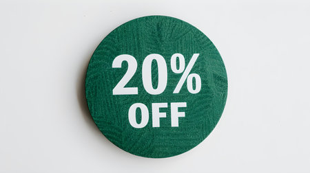 White '20% OFF' Text on a Dark Green Round Paper Note. White background with copy space