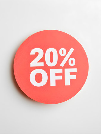 White '20% OFF' Text on a Red Round Paper Note. White background with copy space