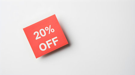 White '20% OFF' Text on a Red Square Paper Note. White background with copy space