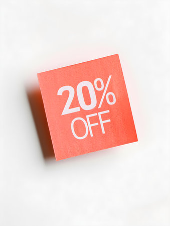 White '20% OFF' Text on a Light Red Square Paper Note. White Background