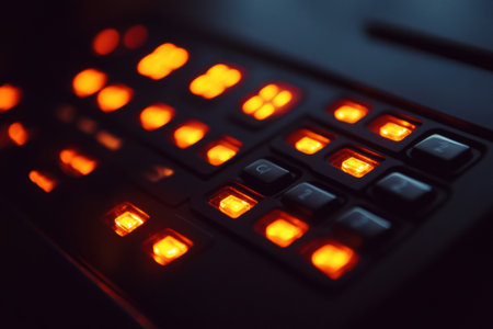 Control panel close up showing illuminated square buttons and switches on an electronic interface, representing advanced technology, engineering, and digital systems