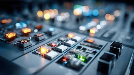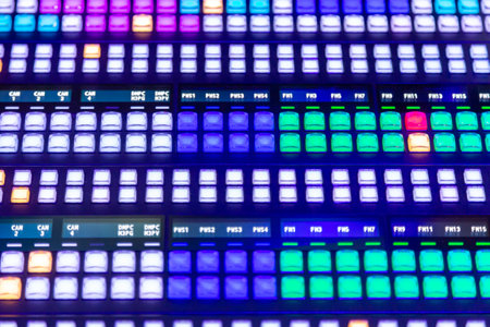 Sound mixer control panel close up with shallow depth of field and lights