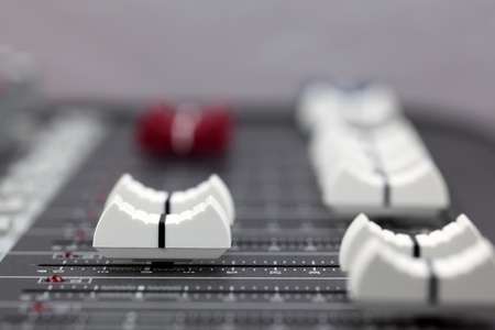 Closeup of audio mixing console. Shallow depth of field