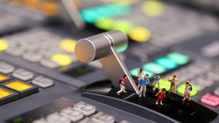 Miniature people : children and student on switcher control of Television Broadcast,color buttons.