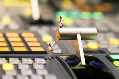Miniature people : worker painting on switcher control of Television Broadcast,color buttons