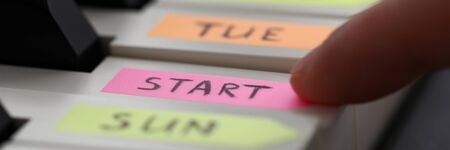 Letterbox view of male finger pressing piano key with start sign on it as begin of new lifestyle and sport activities and future achievements prospects concept