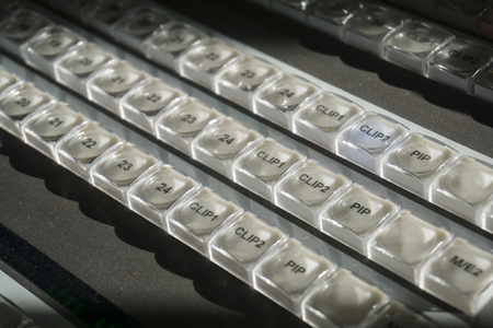 Professional broadcast video switcher. Live television productions, shallow depth of field. Selective focus. Vintage.