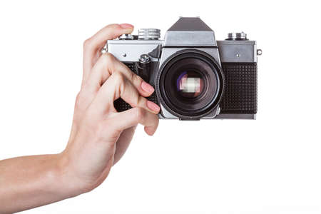Female hands are holding a camera in photo studio close-up. Repair services for camera technology concept.