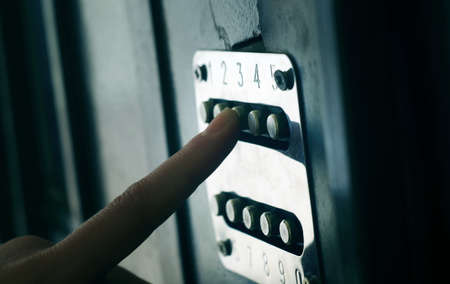 Finger pressing doorbell in apartment building corridor. Close up of male hand ringing door bell in a block of flats. Unwanted guest, bad news or neighbor complaining. Dramatic and negative feeling.
