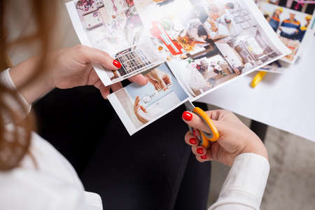 A man cuts out photos with people in close-up. A man uses scissors to cut printed photos for an album. A person holds a photo in his hands against the background of other photos.