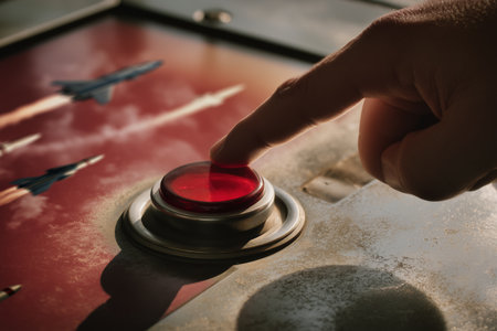 A finger presses a large red button on a panel displaying launching missiles, signifying the critical act of initiating war and conflict.